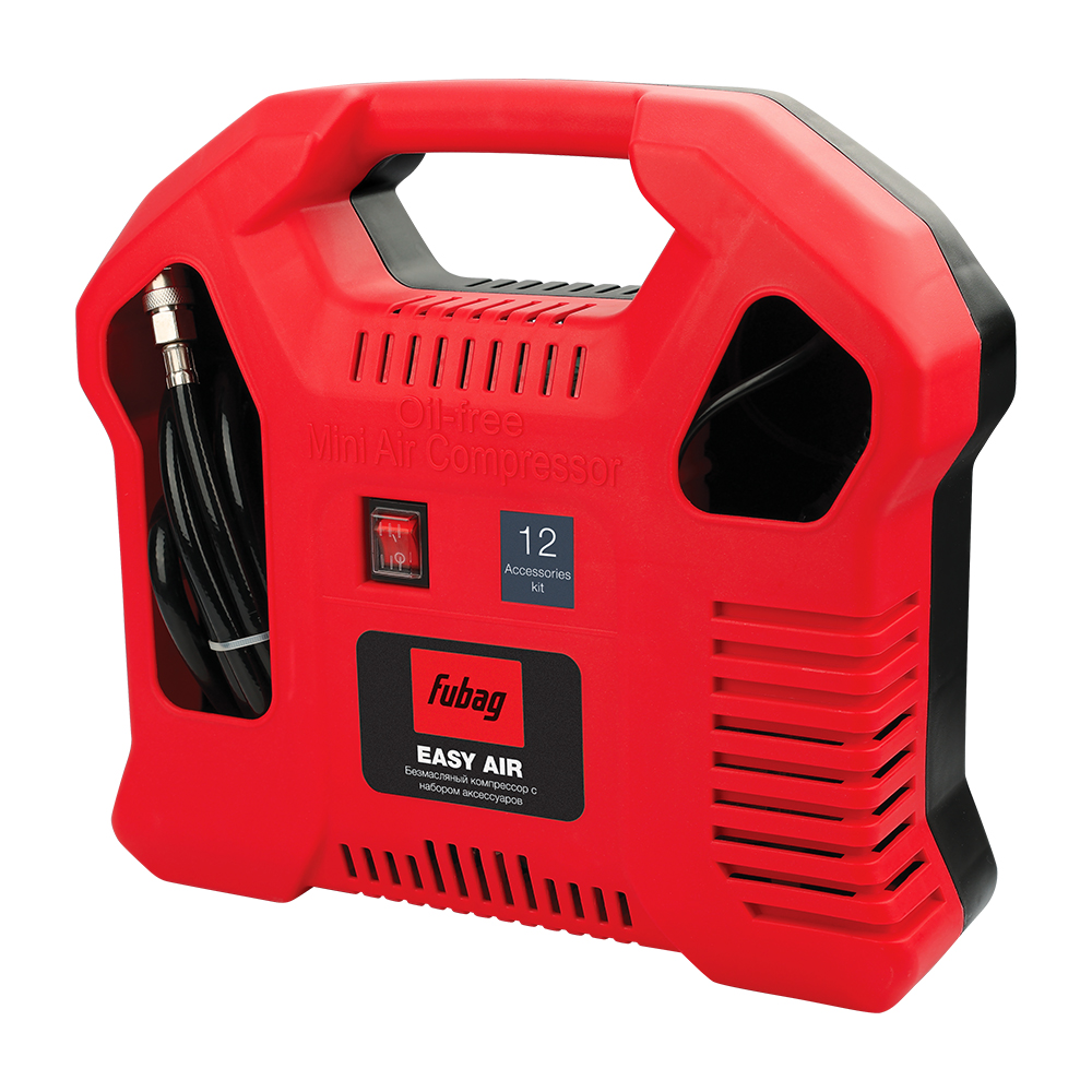 Компактный набор FUBAG Easy Air для работы со сжатым воздухом. Набор FUBAG Easy Air — это мобильный комплект на базе коаксиального безмасляного компрессора (без ресивера). Он обеспечивает подачу чистого сжатого воздуха для накачки шин, спортивного инвентаря, продувки и очистки. Благодаря компактной конструкции и исполнению в виде чемодана, комплект удобен для перевозки и хранения.